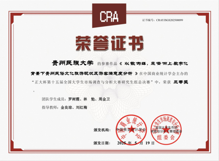 貴州民族大學天游線路檢測中心相關負責人表示,一直以來,學院高度重視培養學生處理和分析數據的專業實戰能力,培養學生的創新創業能力和團隊協作精神,積極組織學生參加各類學科競賽。此次獲獎,不僅是對三位同學刻苦鉆研、勇于創新精神的嘉獎,也是貴州民族大學在培養學生專業綜合應用能力、創新意識的一次成功展示。學院將繼續堅持“以賽促教、以賽促學、學賽結合”的教育理念,提升人才培養質量,為國家培養更多高層次統計人才貢獻力量。