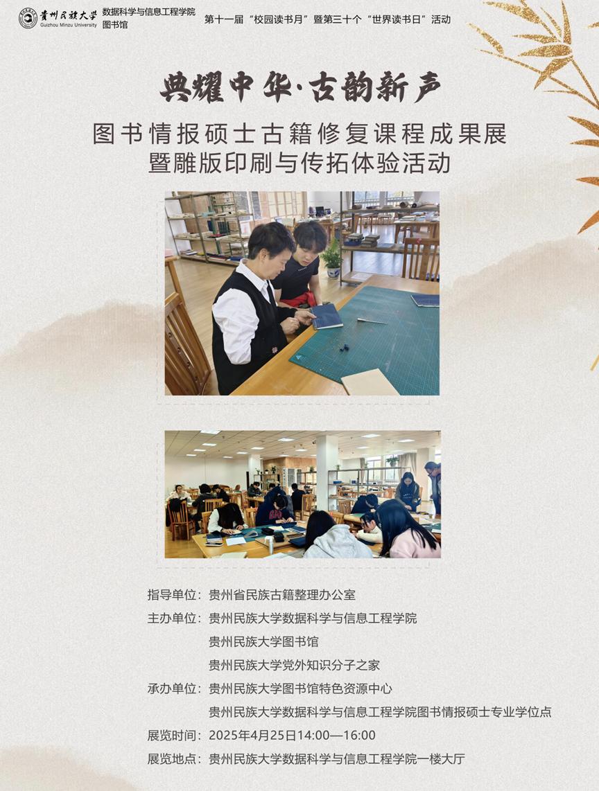 這個春天,我們以書為媒,與古對話。4月25日,“典耀中華·古韻新聲”圖書情報碩士古籍修復(fù)課程成果展暨雕版印刷與傳拓體驗(yàn)活動即將啟幕,帶你沉浸式感受古籍修復(fù)的匠心之美!