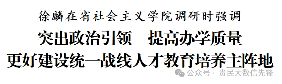 12月2日,省委書記、省人大常委會主任徐麟到省社會主義學院調研。他強調,要深入學習貫徹中共二十屆三中全會精神和習近平總書記關于做好新時代黨的統(tǒng)一戰(zhàn)線工作的重要思想,準確把握《社會主義學院工作條例》要求,堅持高質量立院、高標準辦學,更好建設統(tǒng)一戰(zhàn)線人才教育培養(yǎng)主陣地,為譜寫中國式現(xiàn)代化貴州篇章多作貢獻。省委常委、省委統(tǒng)戰(zhàn)部部長郭強,省委常委、省委秘書長郭錫文,省政協(xié)副主席、省社會主義學院院長張光奇參加。